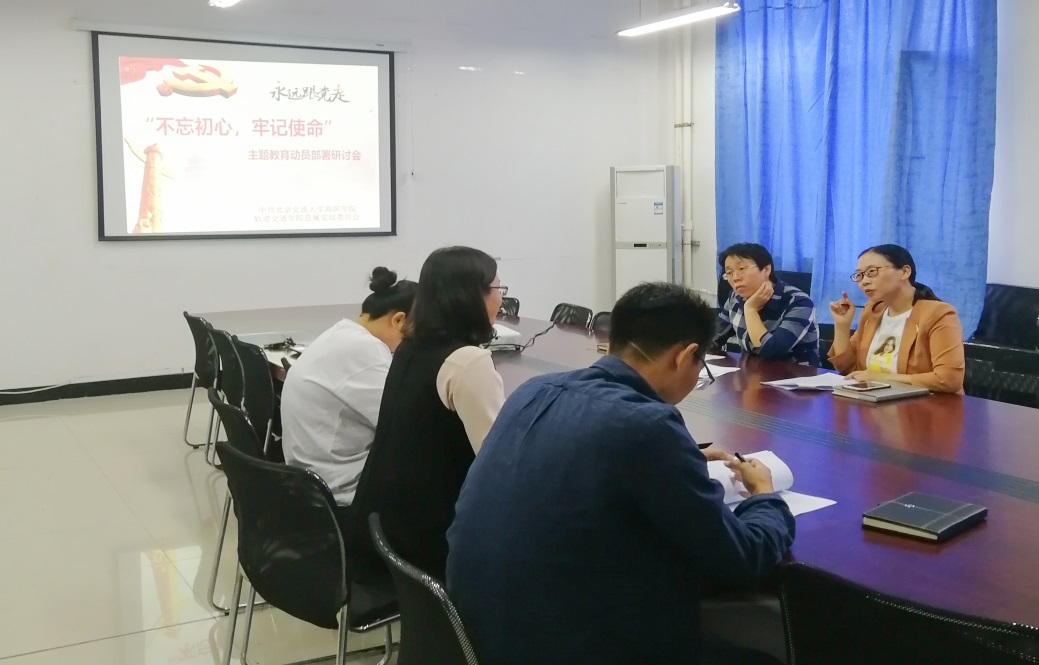 9月19日上午,我校轨道交通学院在思源楼203会议室召开“不忘初心、牢记使命”主题教育动员部署研讨会。参加本次会议的有轨道交通学院直属党支部副书记刘志萍、组织委员褚俊英、宣传委员罗凯、纪检监察委员曹海静,本次会议由轨道交通学院直属党支部书记聂正英主持召开。