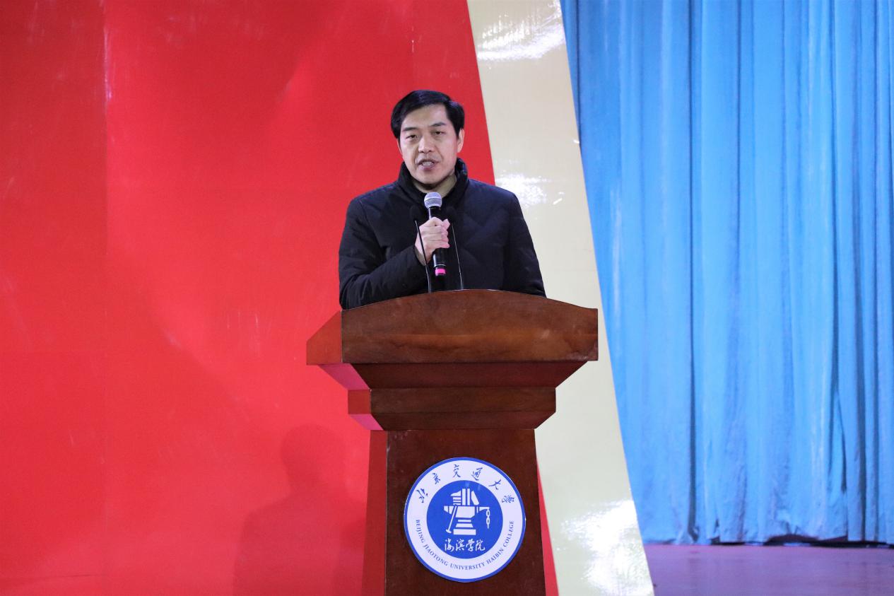 党委书记魏旺强首先代表我校教职员工,向过去一年中取得优异成绩的集体和个人表示热烈的祝贺。他强调,我校全面贯彻党的教育方针,落实立德树人根本任务,坚持以培养综合素质高、理论基础好、实践能力强和具有创新创业意识的高水平应用型人才为目标,大力弘扬“进德修业、知行合一”的校训,积极推进综合素质教育,促进学生全面成长。魏书记表示,今天获得表彰的集体与个人,充分展示了学校在人才培养工作中所取得的成绩,也展示着海滨学子努力奋进、拼搏向上的精神风貌。他对我校学生提出三点要求;一、要胸怀梦想,砥砺前行;二、要求真务实,知行合一;三、要创新进取,追求卓越。最后,他希望我校学生能够以今天受表彰的集体和个人为标杆,人人学榜样,个个争当榜样,在海滨的校园里形成见贤思齐、崇德向善、争做先锋的良好氛围。