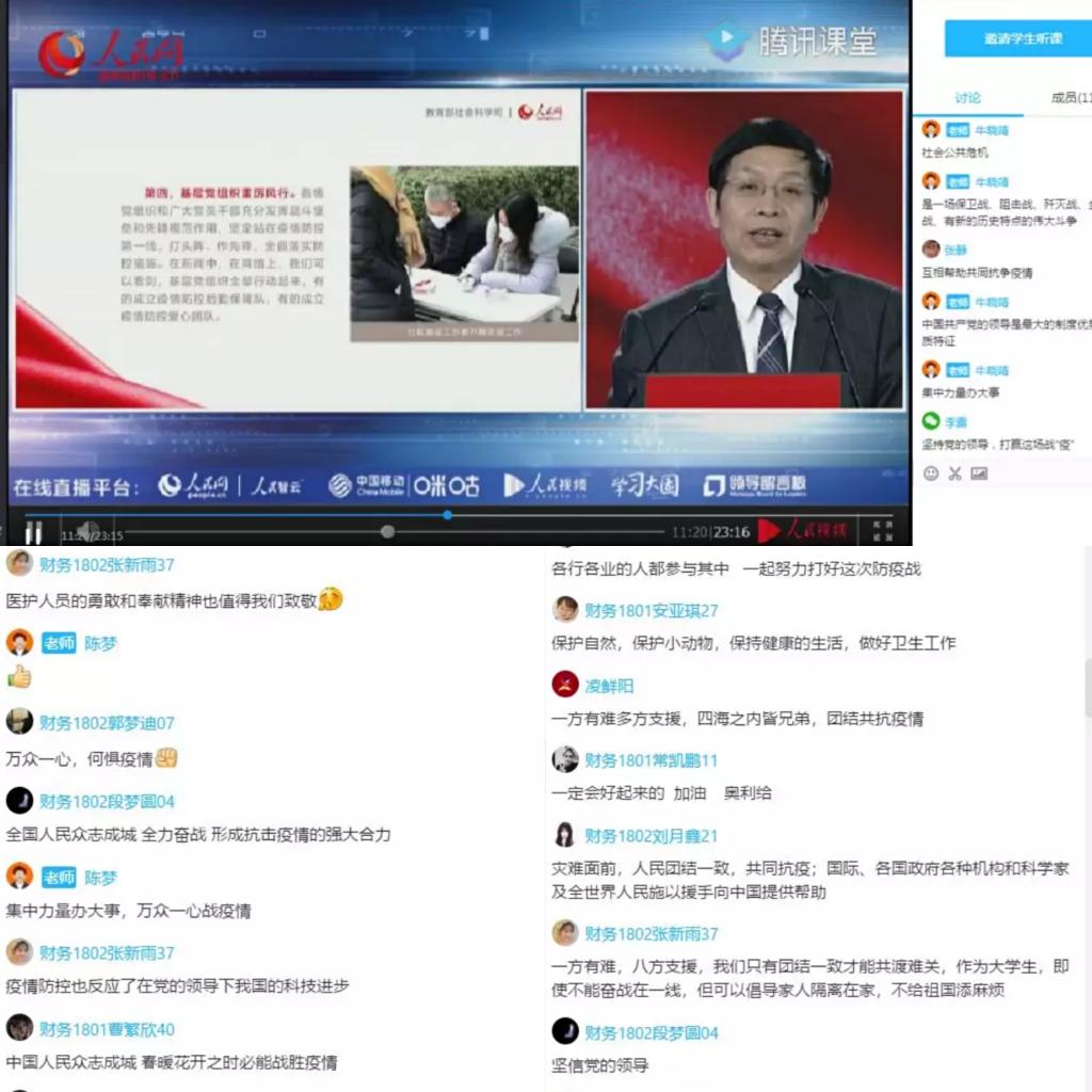 我校党委高度重视“全国大学生同上一堂疫情防控思政大课”的组织工作,宣传统战部、校团委、基础教学部思政教研室等单位和各学院(系)第一时间发布收看通知,思政教研室更是将“全国大学生同上一堂疫情防控思政大课”纳入到疫情防控期间思政课的教学统一安排之中,合理设计教学环节,组织学生进行线上集体讨论,引导学生畅谈感想,将思想政治理论课教学优势转化为防疫斗争的强大力量。