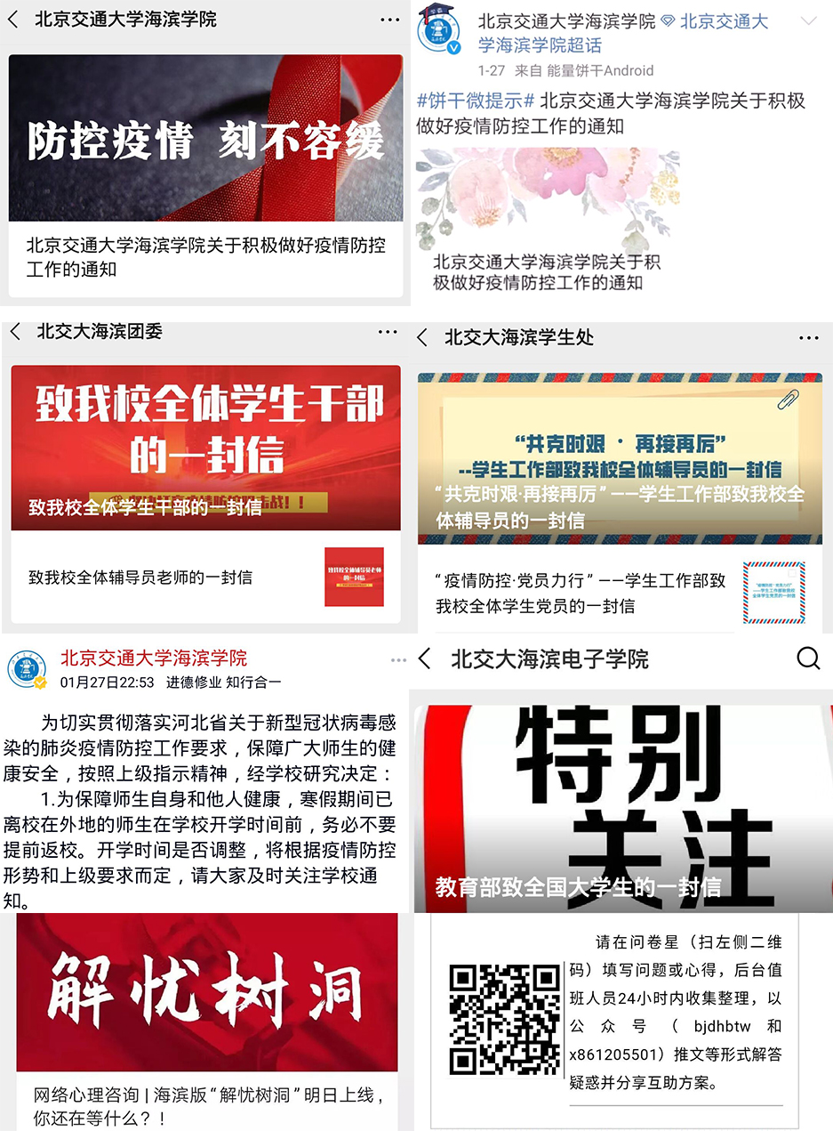 我校建立疫情信息报告体系,对全校教职员工的出行及身体、生活情况进行摸排,并通过校园网、微信、微博、师生群等多种渠道,开展有效的疫情防控教育,引导师生做好自我防护,科学理性认识疫情,不信谣、不传谣,积极完成网络课程的“教”与“学”。学生处面向全校学生开展网络心理咨询服务,保证学生情绪稳定,维护学生心理健康。