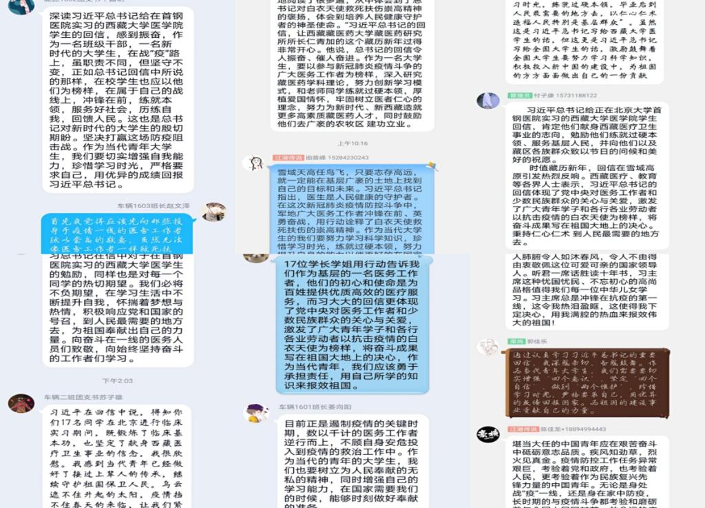 在藏历新年来临之际,抗击疫情的攻坚时刻,习近平总书记于2月21日给正在北京大学首钢医院实习的西藏大学医学院学生回信。我校机械与动力工程学院积极响应学校学习习近平总书记的回信精神,充分利用视频会议及QQ平台,学院教师、辅导员和学生分别进行学习讨论,认真研读习近平总书记的重要回信