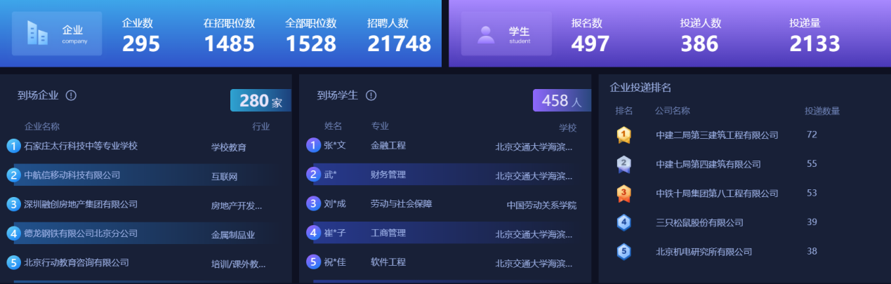 此次双选会,学校最终精选出295家企业参会,为我校2021毕业生提供职位1485个岗位21748个,其中包含国企60家,上市公司24家,外企18家,股份制企业37家,中建二局、中建七局、中铁十局、国药物流、宁波银行、北京学而思等知名企业参与招聘,招聘企业基本覆盖我校所有专业。毕业生通过在线投递简历、线上咨询、视频预约等方式与用人单位充分互动。截至目前,本次空中双选共吸引了我校373名学生参与招聘,投递简历1941份。