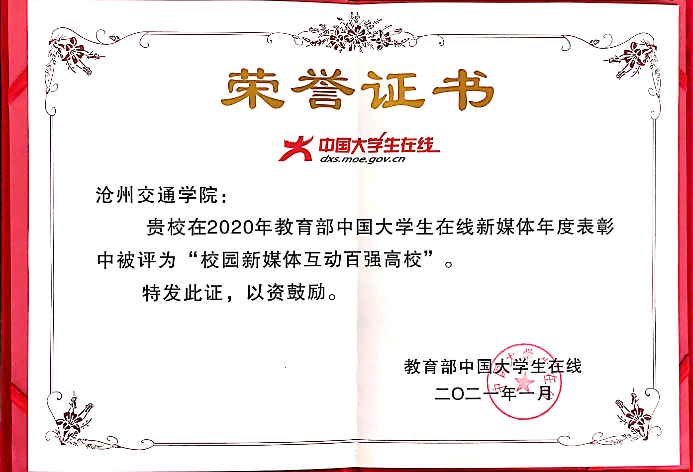 近日,教育部中国大学生在线2020年度新媒体表彰名单公布,我校荣获“中国大学生在线校园新媒体互动百强高校”称号。