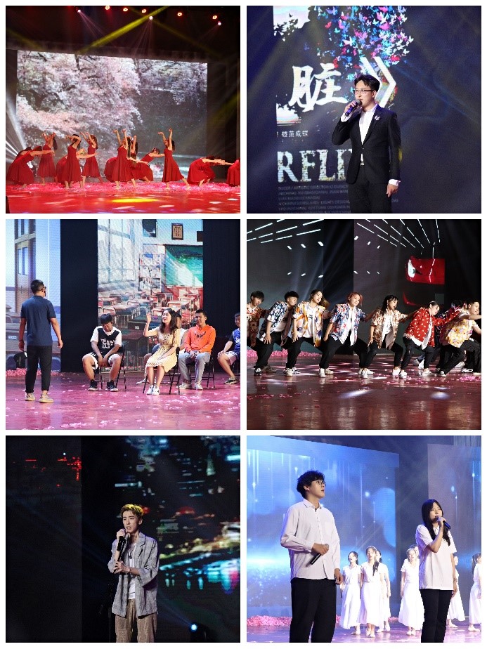 在第一篇章“灿烂韶华记忆,舞蹈《儿时》中身着红色长裙的舞者们在舞台上翩然起舞,手撒粉红色的花瓣,从懵懂的少年蜕变到如今的光彩夺目;歌曲表演《心脏》,恢宏的声音缓缓的流进了我们的心脏,初心使命我们就此抓住不放;小品《我的大学生活》,宿舍、自习课、毕业典礼,以新颖的方式讲述着我的大学生活;舞蹈《一路上有你》,跳跃的音符,激荡着青春的活力,动感的舞姿,展示着青春的魅力;歌曲串烧《空城》《飘向北方》《追光者》让人泪目但却满满能量。