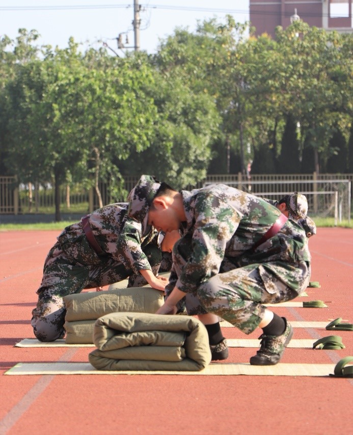 在《分列式进行曲》铿锵的节奏中,各个方阵依次迈着整齐的步伐走过主席台接受检阅,他们昂扬自信、雄姿英发、步履铿锵、神采飞扬,坚定的摆臂、整齐的步伐、嘹亮的口号彰显了2020级学子热情饱满的精神面貌。“出门看队伍,进门看内务”,寝室内务整理是军训的重要内容之一。内务表演方阵的学员们“铺平”“压实”“翻折”“捏角”,得心应手,游刃有余。在拼字方阵表演中,学员们不断变换阵型,摆出“中国”“党徽”“钟楼”等巨幅图案。以“青春之歌”唱响祖国,直抒爱党爱国情怀。女生匕首操表演气势恢宏、刚劲有力,透露出巾帼不让须眉的英雄气概,赢得看台观众阵阵掌声。男生们的军体拳表演犹如蛟龙出海、猛虎下山,展示出2020级学员的飒爽英姿。行云流水的动作让观众震撼称奇,一度将现场气氛推至高潮。