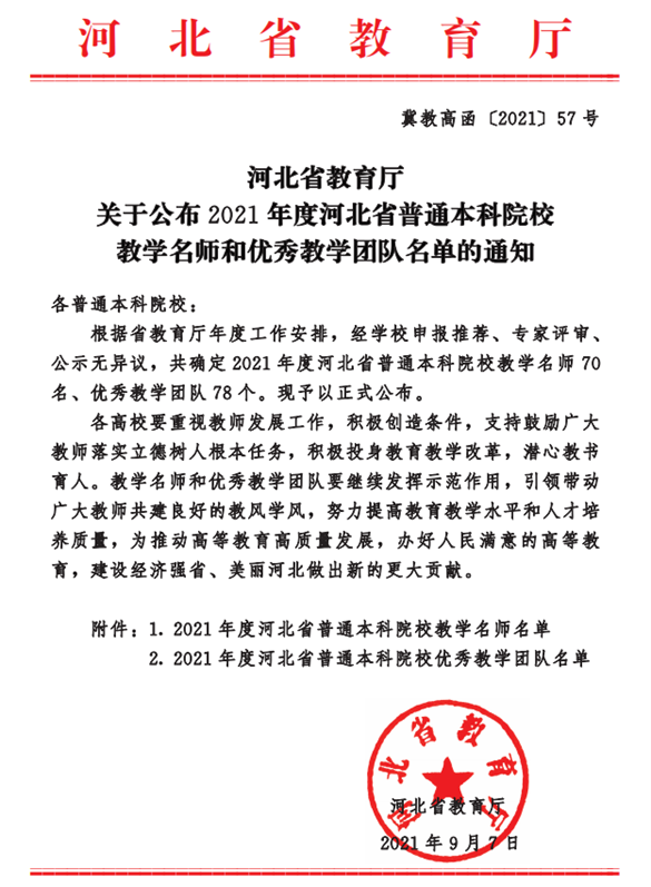 近日,河北省教育厅公布了2021年度河北省普通本科院校教学名师和优秀教学团队名单,我校田春子副教授荣获2021年河北省普通高等学校本科教学名师称号,以电子与电气工程学院郭彬副教授为带头人的“电工电子基础课程教学团队”荣获2021年河北省普通高等学校本科优秀教学团队。