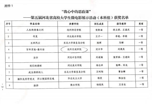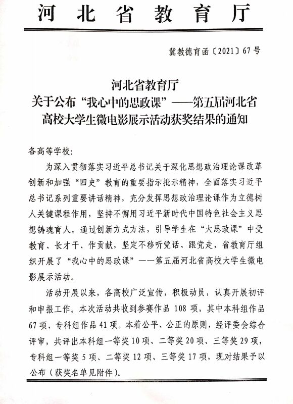 近日,河北省教育厅公布“我心中的思政课”第五届河北省高校大学生微电影展示活动获奖名单,我校两项参赛作品荣获奖项。
