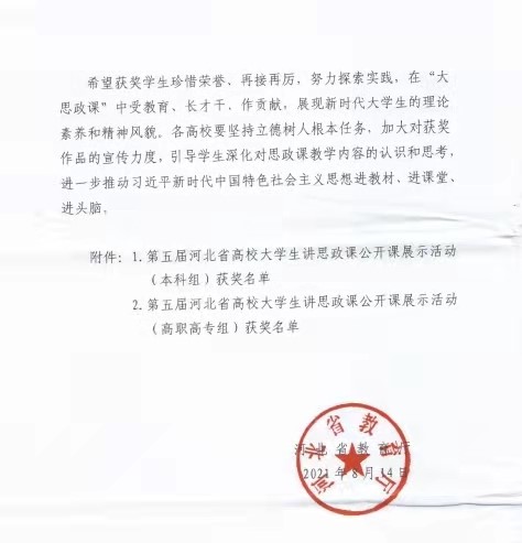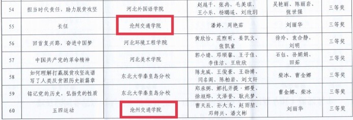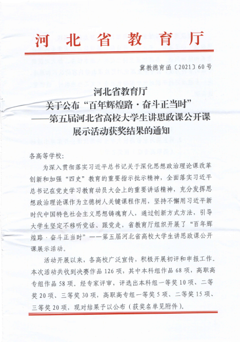 近日,河北省教育厅公布了“百年辉煌路·奋斗正当时”——第五届河北省高校大学生讲思政课公开课展示活动获奖结果的通知。我校《长征》《五四运动》两项参赛作品在此次评选中荣获三等奖。