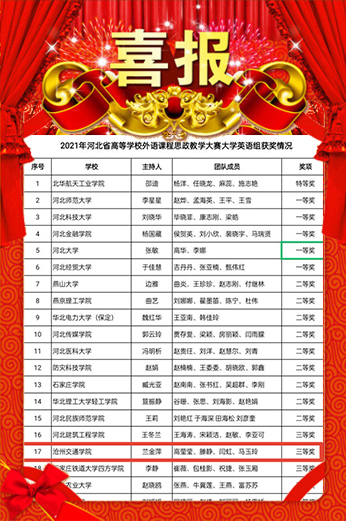 据了解,本次大赛由河北省高等学校外语教学指导委员会、河北省高等学校外语教学研究会高等教育出版社、河北师范大学承办,共有63个教学团队进入决赛,其中大学英语组29个。我校教师团队凭借扎实的知识功底,良好的逻辑思维能力、协调沟通能力以及抗压能力,经过比赛现场的激烈角逐,层层选拔,最终荣获大赛三等奖。