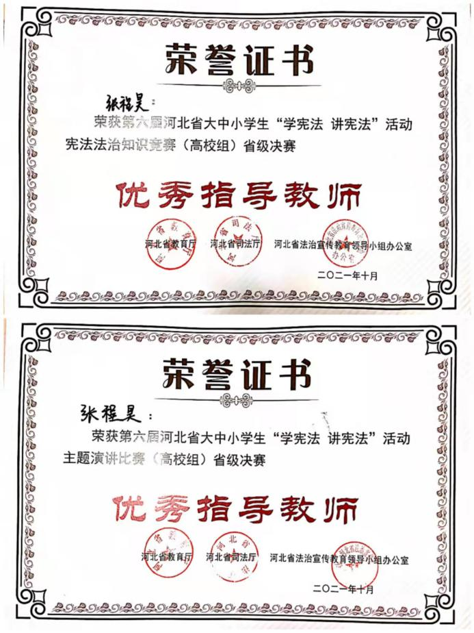 教师张程昊在本次比赛中获得“学宪法 讲宪法”活动宪法法治知识竞赛(高校组)省级决赛优秀指导教师和活动主题演讲比赛(高校组)省级决赛优秀指导教师两项荣誉称号。