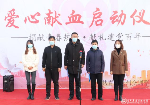 11月13日清晨开启无偿献血启动仪式,沧州市中心血站副站长李静办公室副主任陈婧宇服务科科长赵国宏以及沧州交通学院学生处处长王庆松、团委书记曹蒙春一同出席活动。