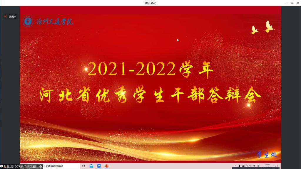 根据河北省教育厅文件精神,为深入贯彻习近平新时代中国特色社会主义思想和党的十九大及十九届历次全会精神,展现当代青年学生奋发向上的精神风貌,树立学生先进典型,引导广大学生自觉成长为德智体美劳全面发展的社会主义建设者和接班人,结合当前疫情防控实际,我校于4月9日15:00以线上形式组织2021-2022学年河北省优秀学生干部答辩会。