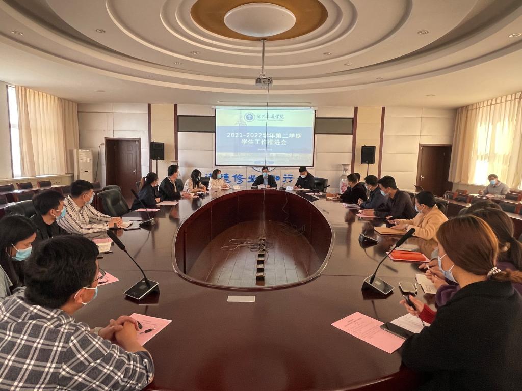2022年4月5日上午10:00,我校在行政楼B512会议室召开2021-2022学年第二学期学生工作推进会,党委副书记吴立军出席会议,学生处负责人、各学院主管副院长、团委书记及学生处全体老师参加本次会议。本次会议采取线上与线下相结合的方式,会议由学生处处长王庆松主持。