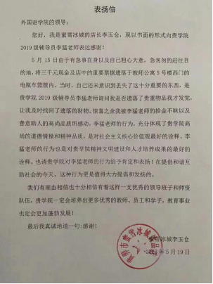 有一种美德,能让人与人之间架起信任之桥,能让陌生人的脸上泛起由衷的微笑,能为这个社会注入和谐温暖的正能量。515日我校外国语学院收到了一封来自蜜雪冰城李店长的感谢信。